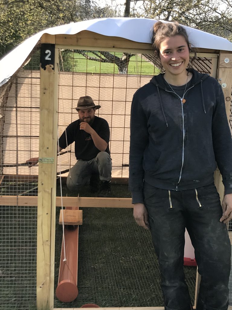 Unsere Tiere leben in selbstgebauten Mobilställen mit viel Auslauf. Sie bekommen Sonne, Regen, frische Luft und Schatten, fressen Gras, Fallobst und leckere Insekten unter den Streuobstbäumen .